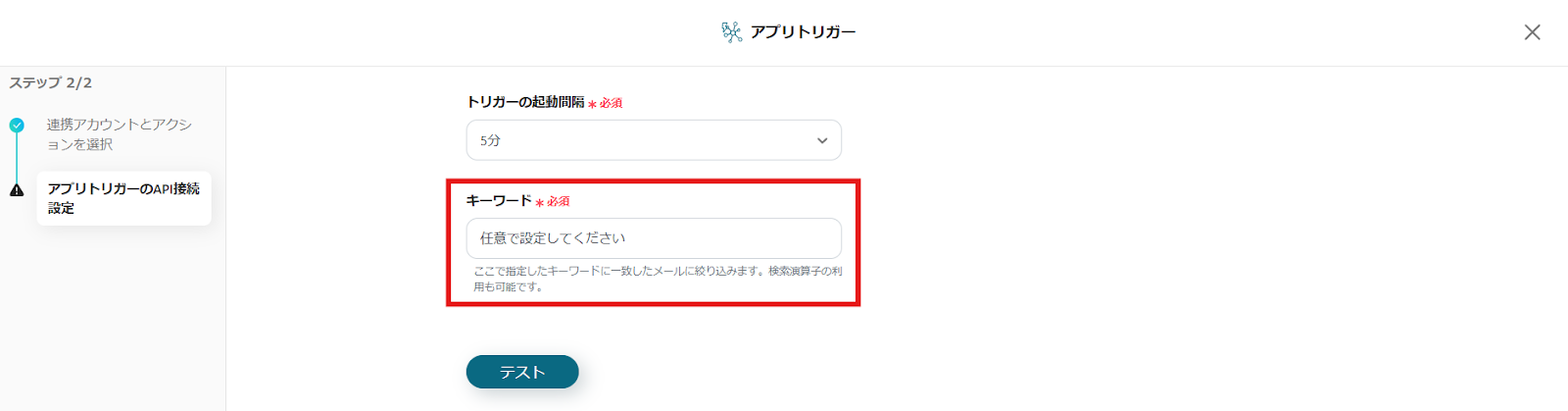どのようなキーワードが含まれている件名のメールを検知するか指定します。