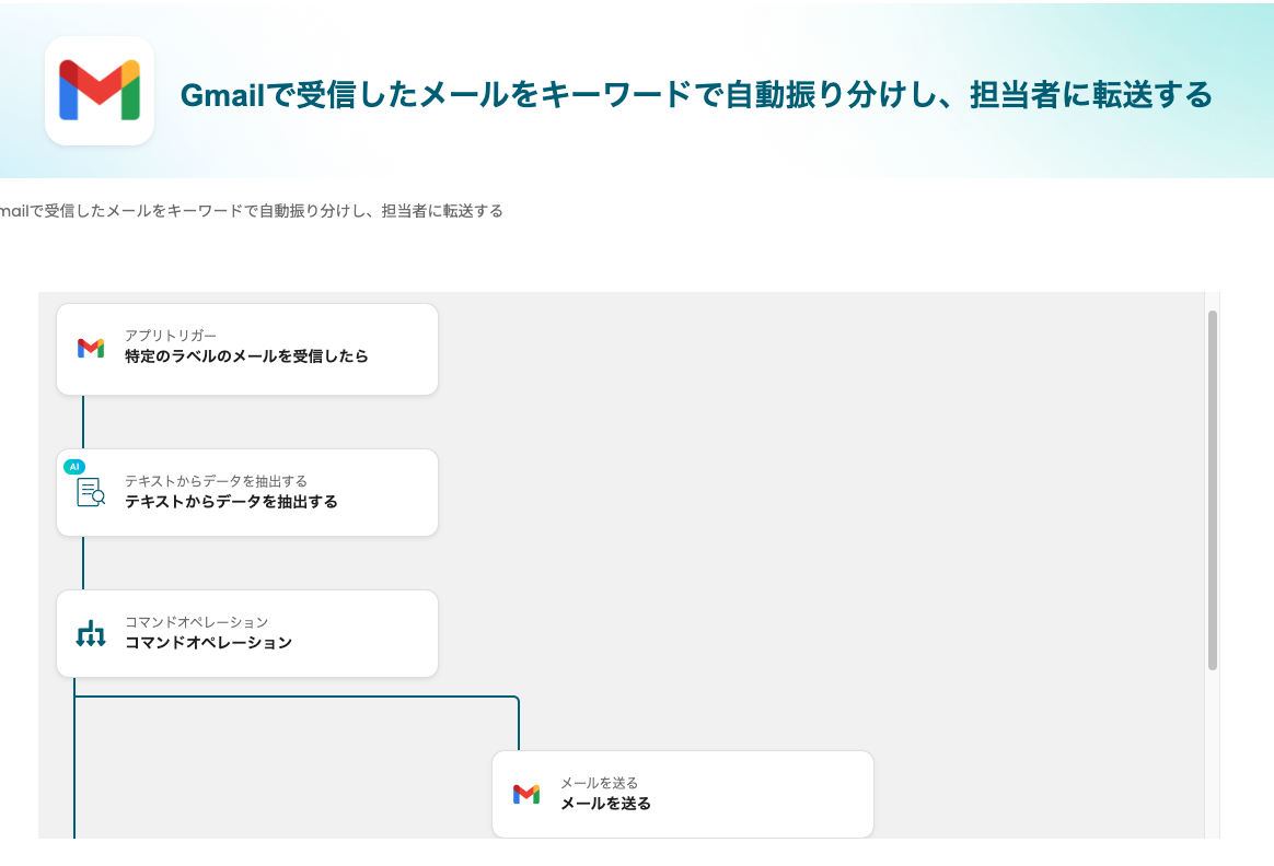 Gmailで受信したメールをキーワードで自動振り分けし、担当者に転送するフローです。