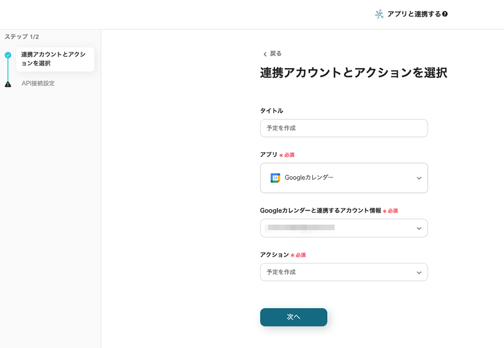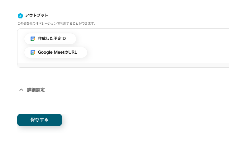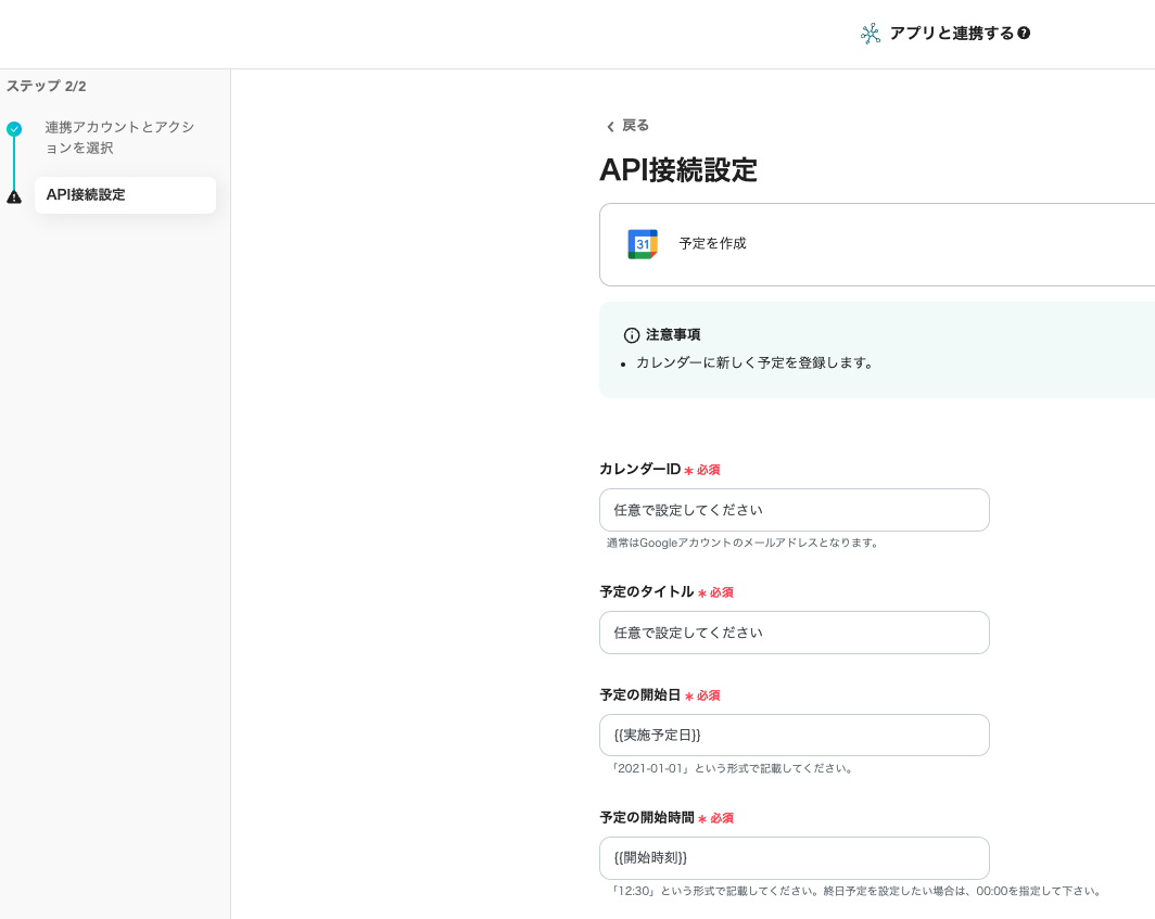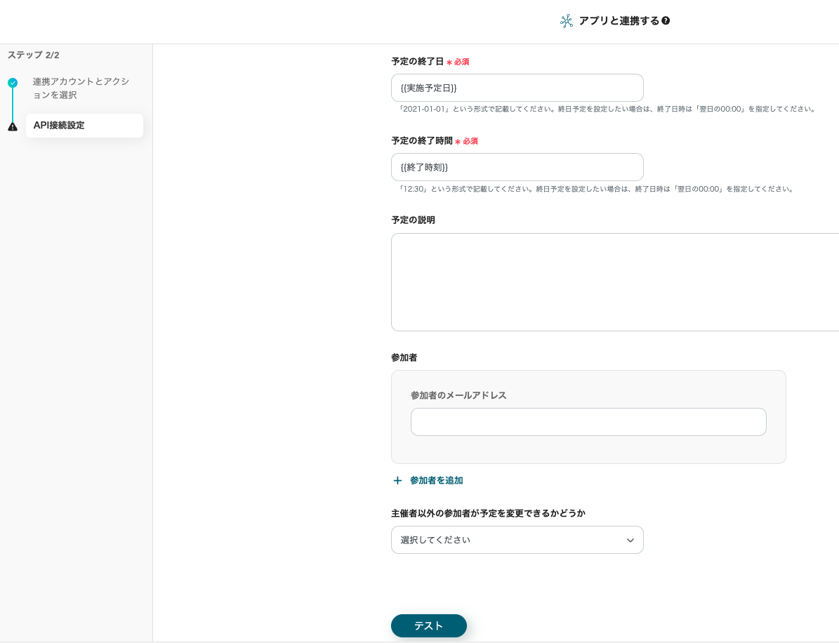テストを行って次に進みます。予定の開始時刻・終了時刻の設定が終わったら、Googleカレンダーの設定です。