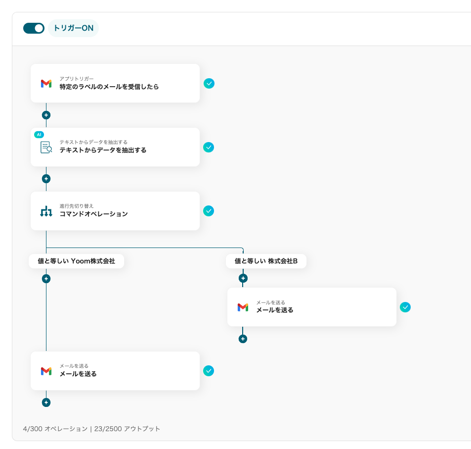 Gmailでメールを受信したら、キーワードを抽出して自動振り分けを行い、適切なSlackのチャンネルに通知するフローです。