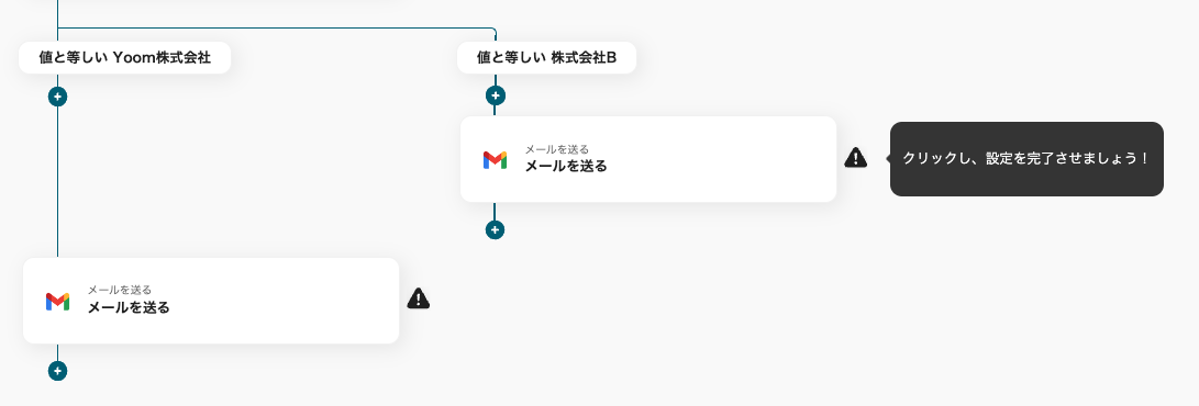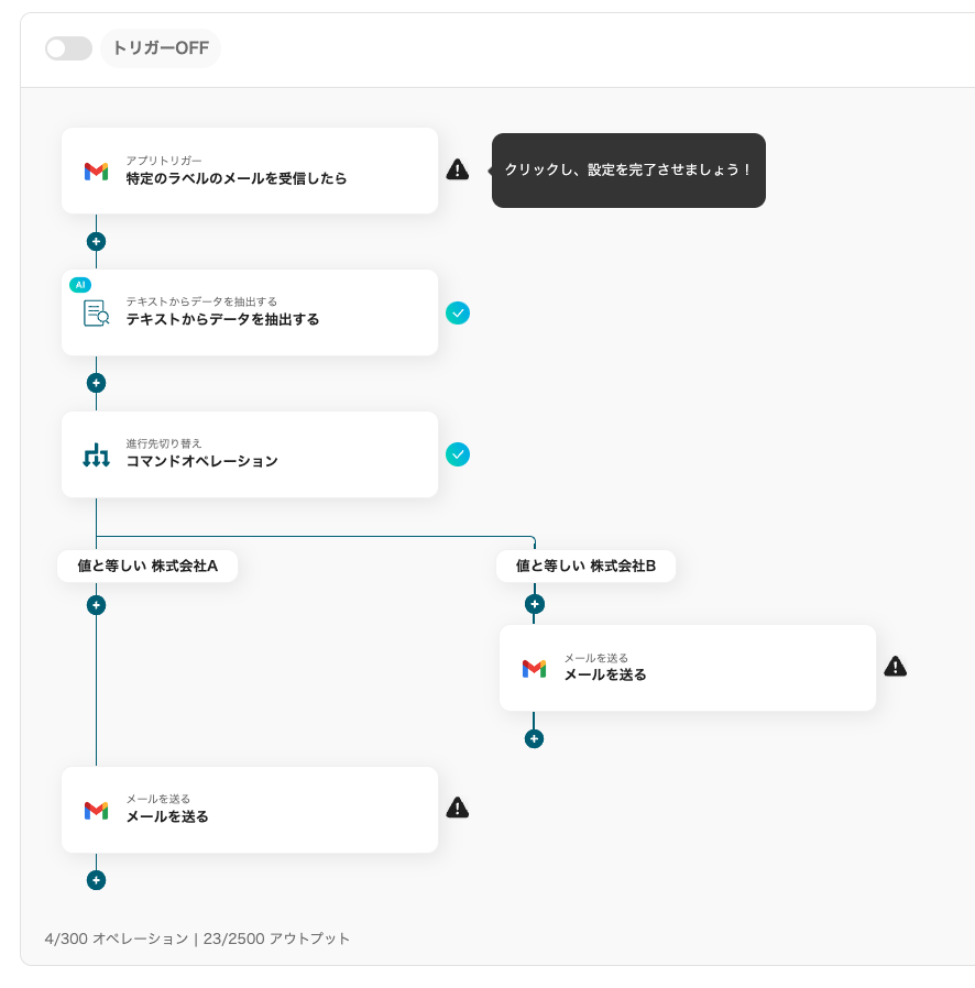 テンプレートの4・5つ目の工程をクリックします。振り分けたメールの送信先を設定します。操作方法は同じで、送信先の設定のみが異なります。