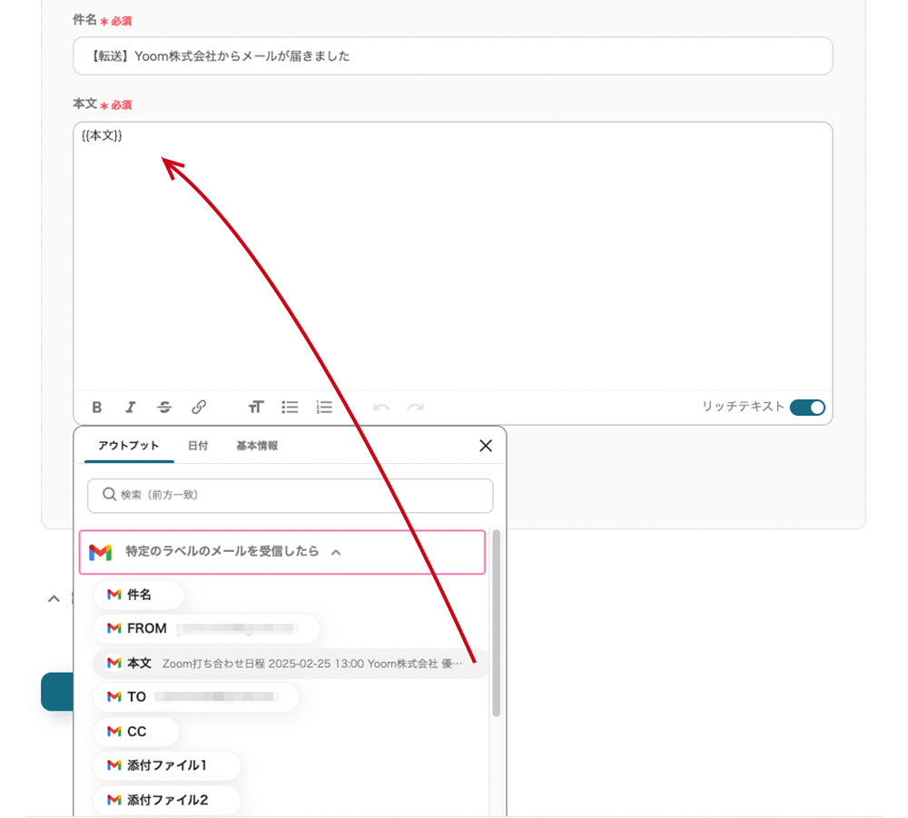 - 受信したメールの本文の引用コードを埋め込みます。編集欄をクリックしてプルダウンメニューを開きます。メニュー内<アウトプット<特定のラベルのメールを受信したら の中に表示されますので、選択して埋め込みましょう。