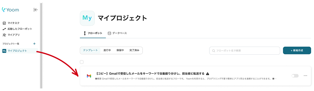 コピーしたテンプレートは、マイプロジェクトから一覧に格納されます。マイプロジェクトは左のメニューバーからアクセス可能です。