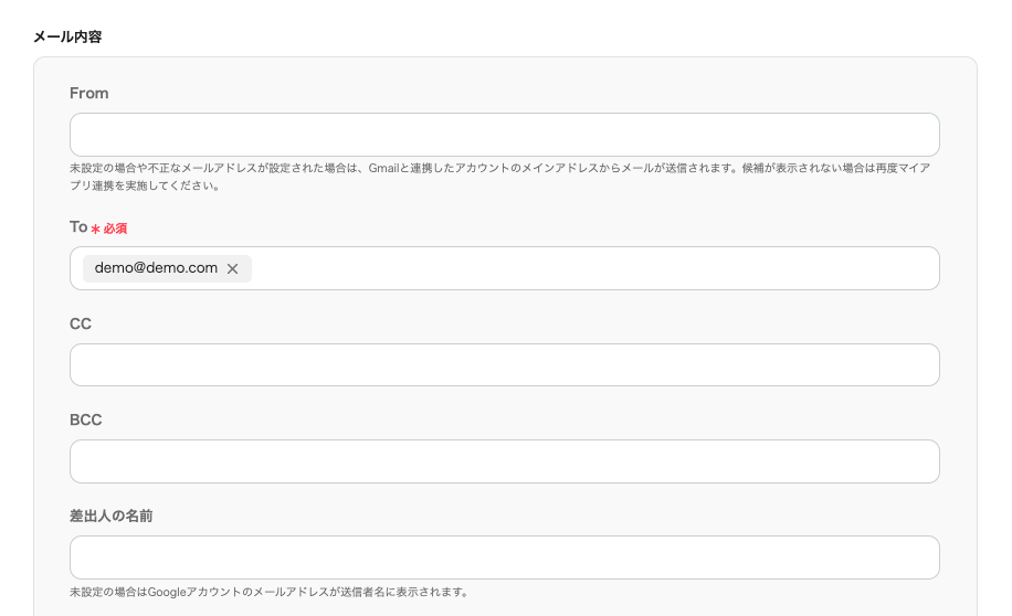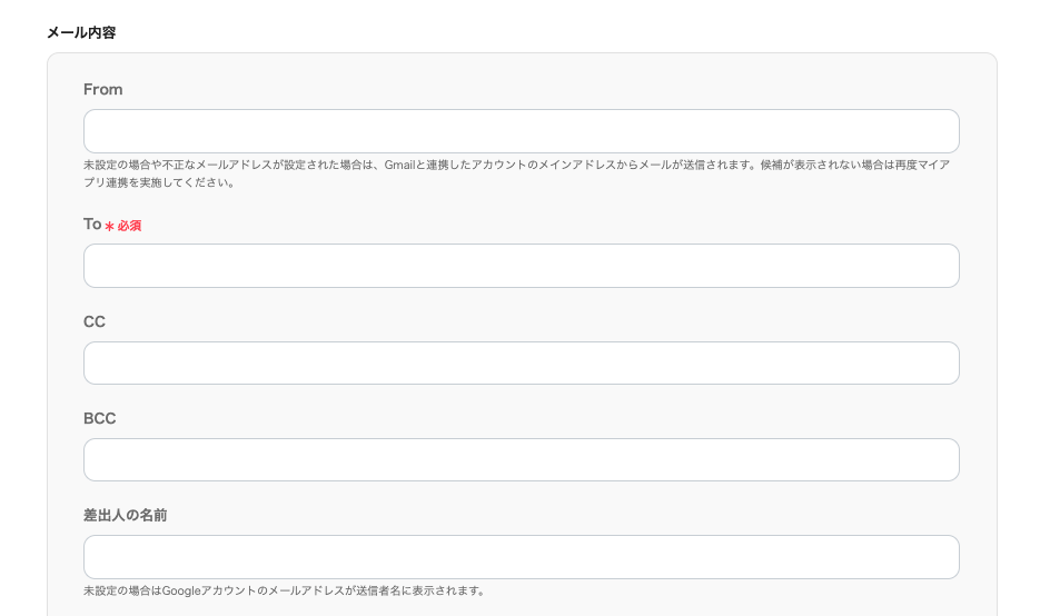 検索結果からアプリ名をクリックします。Gmailから取得した値を入力する画面が表示されます。