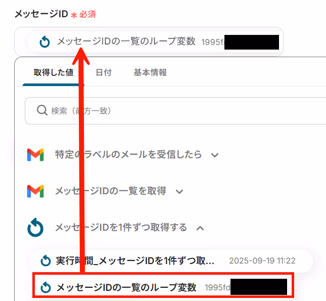 メッセージIDは前項で取得した値から「メッセージIDの一覧のループ変数」を選択します。