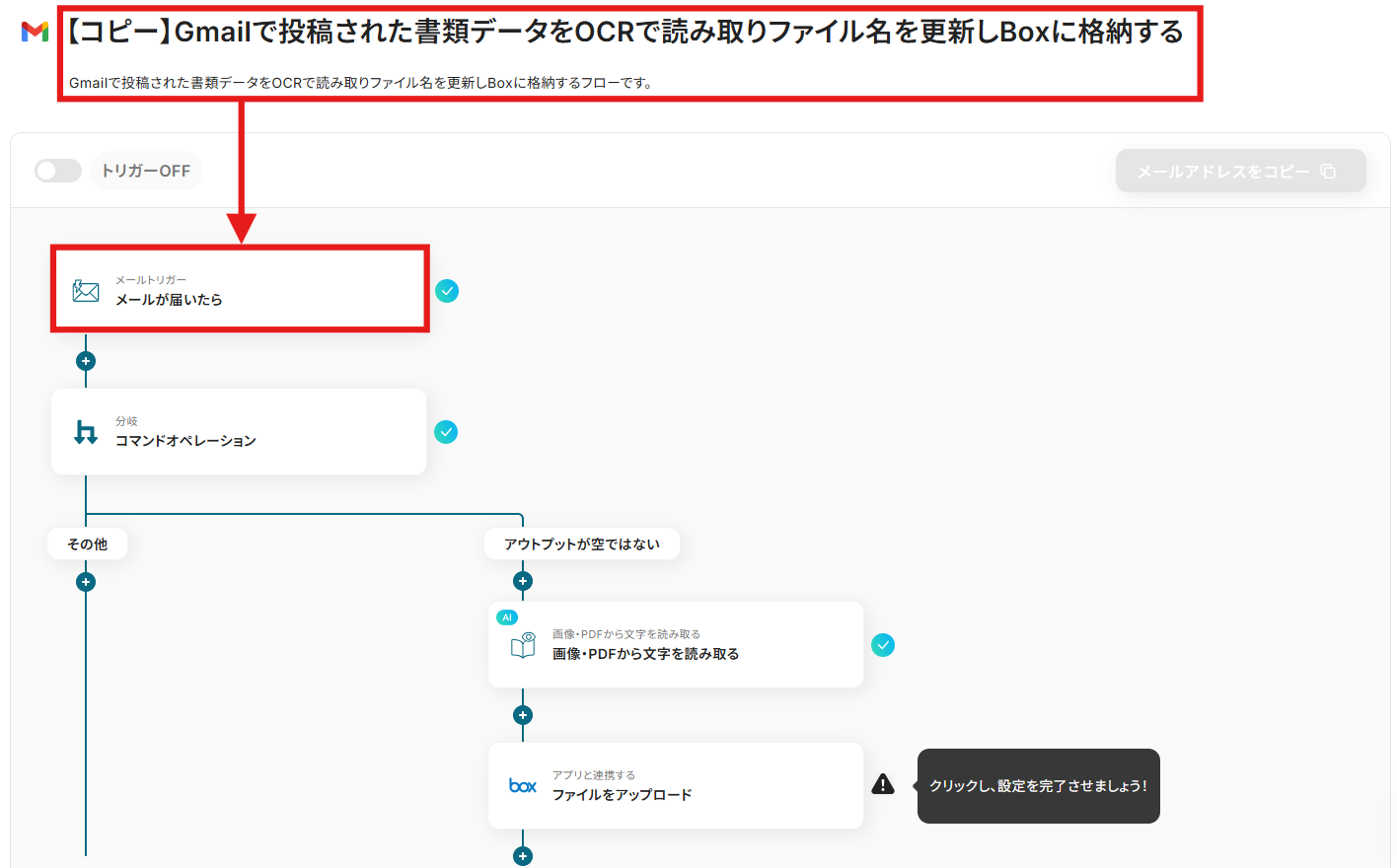 1.Gmailの添付ファイルをOCRで読み取り、Boxに自動保存するフローです。