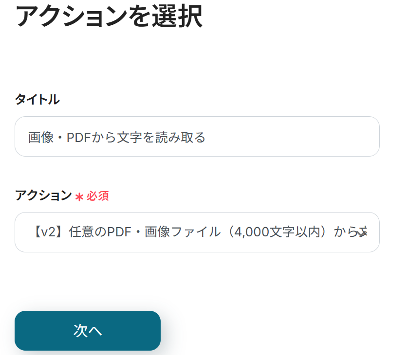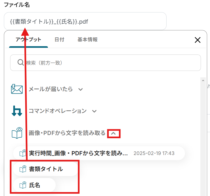 「画像・PDFから文字を読み取る」のアウトプットを使用することで、自動的にファイル名を作成できます。