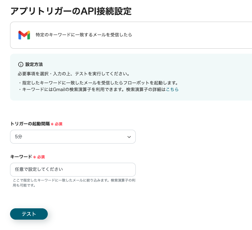 検索結果からアプリ名をクリックします。Gmailから取得した値を入力する画面が表示されます。