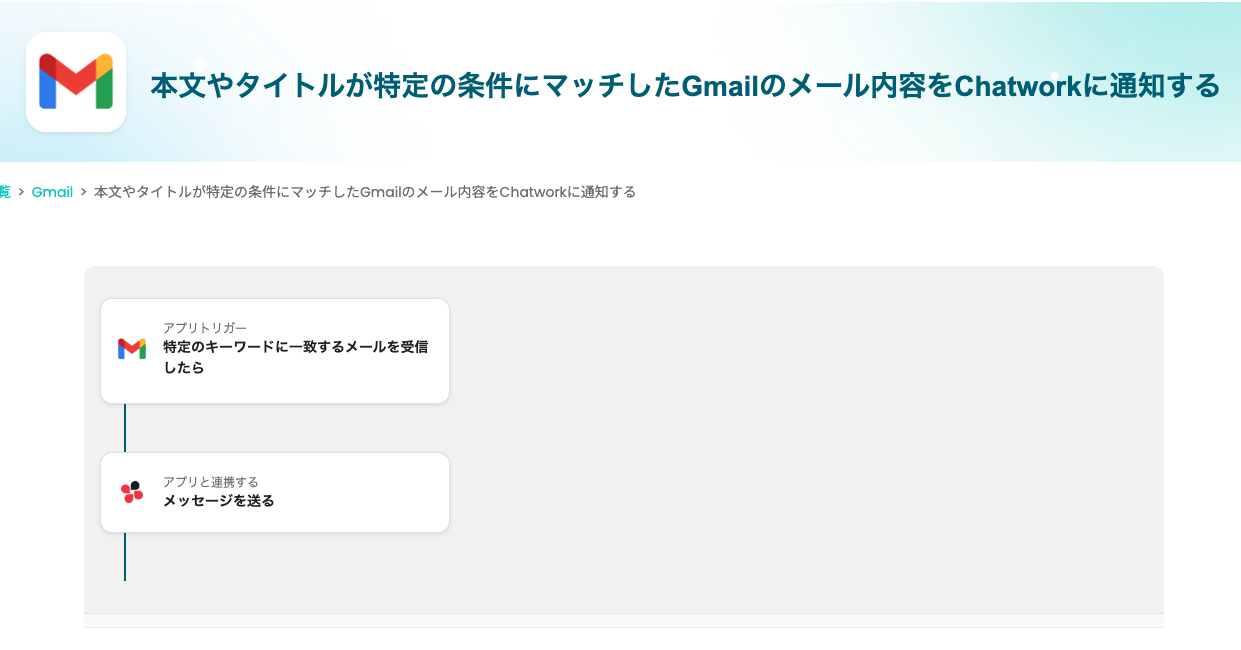 ここからは、「本文やタイトルが特定の条件にマッチしたGmailのメール内容をChatworkに通知する」自動化の設定方法を、Yoomのフローボットテンプレートを使って解説します。