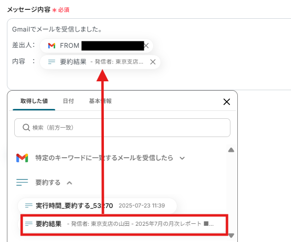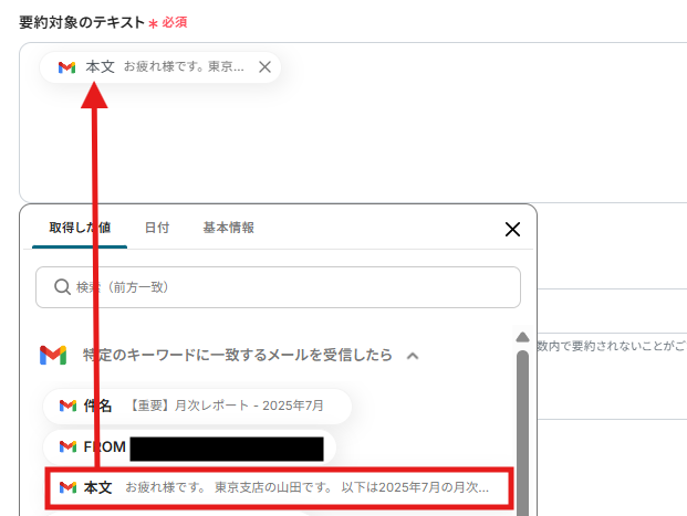 編集欄をクリックし、取得した値の「特定のキーワードに一致するメール」を選択し、本文を選んでください。