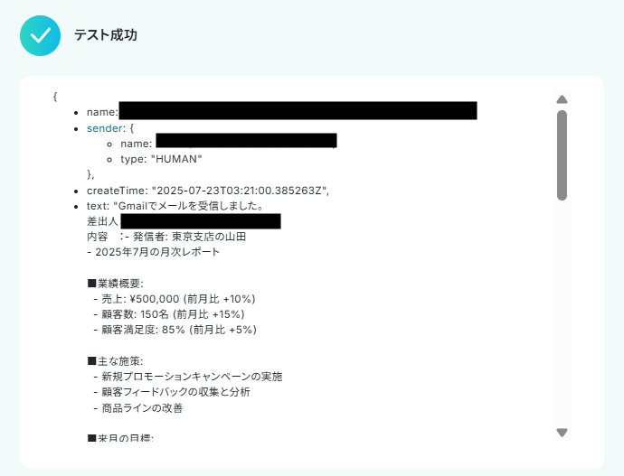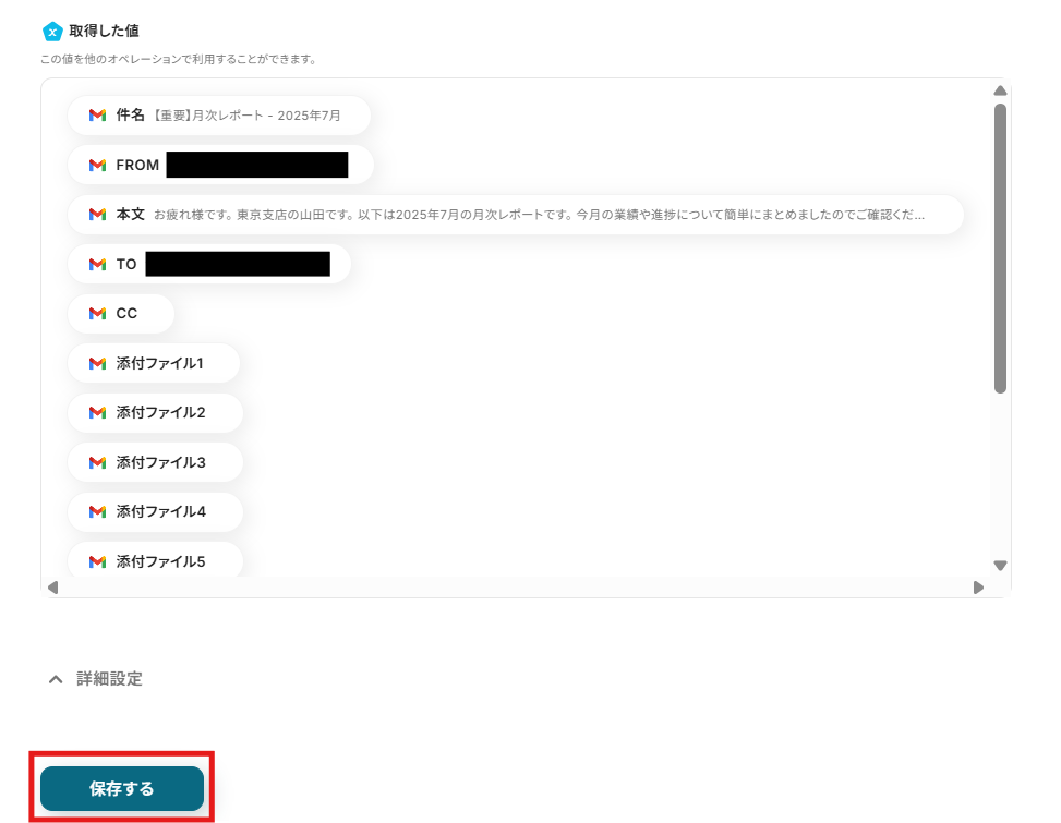 テストに成功すると、取得した値の各項目の横に先ほど送信したGmailの詳細情報が表示されます。