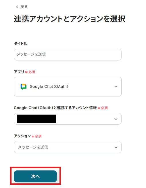 Google Chatと連携するアカウント情報を確認し、トリガーアクションは「メッセージを送信」のままで「次へ」をクリックします。