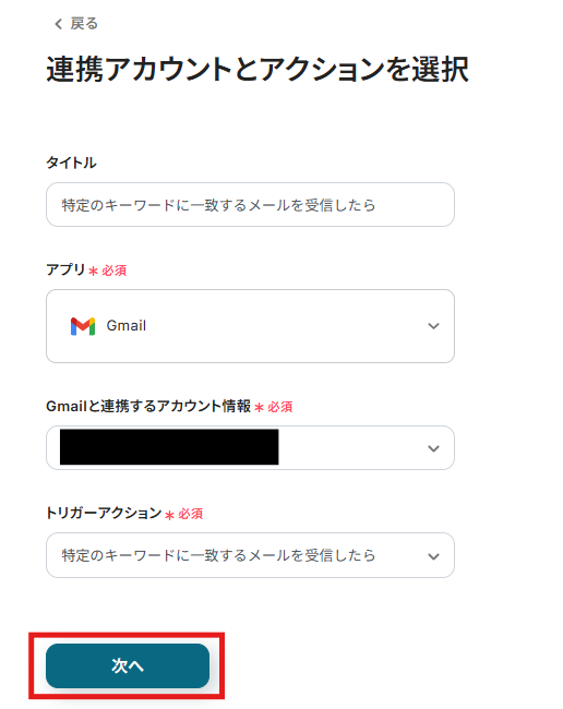 Gmailと連携するアカウント情報を確認し、トリガーアクションは「特定のキーワードに一致するメールを受信したら」のままで「次へ」をクリックします。