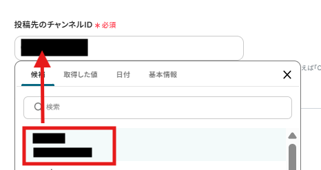 編集欄をクリックすると、Slackのチャンネル候補が表示されるので、そこから対象のチャンネルを選択します。選択するとIDが自動で入力されます。