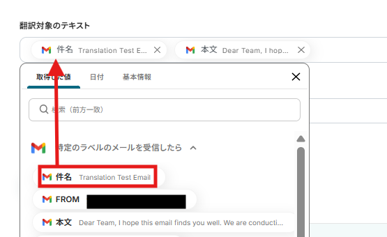 編集欄をクリックし、「特定のラベルを受信した場合」を選択すると、翻訳対象として追加できる候補が表示されます。