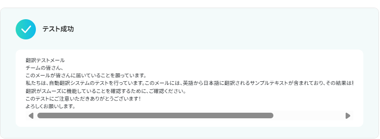 テストに成功すると、以下のように翻訳された文章が表示されます。「保存する」をクリックして次の設定に進みましょう。