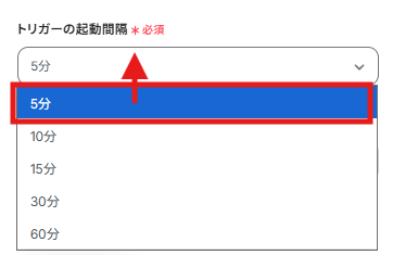 トリガーの起動タイミングは、5分、10分、15分、30分、60分から選択可能です。ご利用プランによって設定できるトリガーの最短間隔が違うので、ご注意ください。