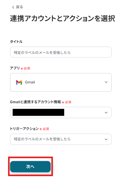 トリガーアクションはテンプレート通り「特定のラベルのメールを受信したら」のままで「次へ」をクリックして進んでください。
