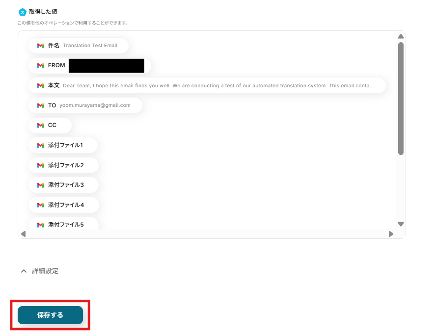 テストに成功すると取得した値の横に、先ほど送信したGmailの詳細情報が表示されますので、「保存する」をクリックします。