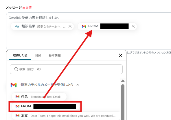 編集欄をクリックすると「取得した値」の情報を簡単に引用できるので、必要な情報を入力しカスタマイズします。