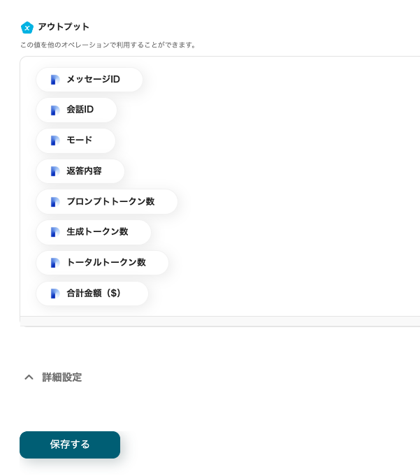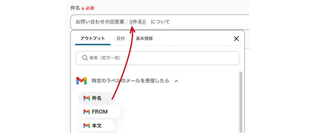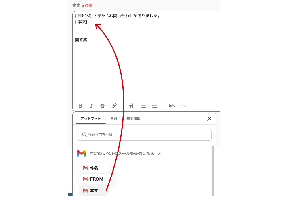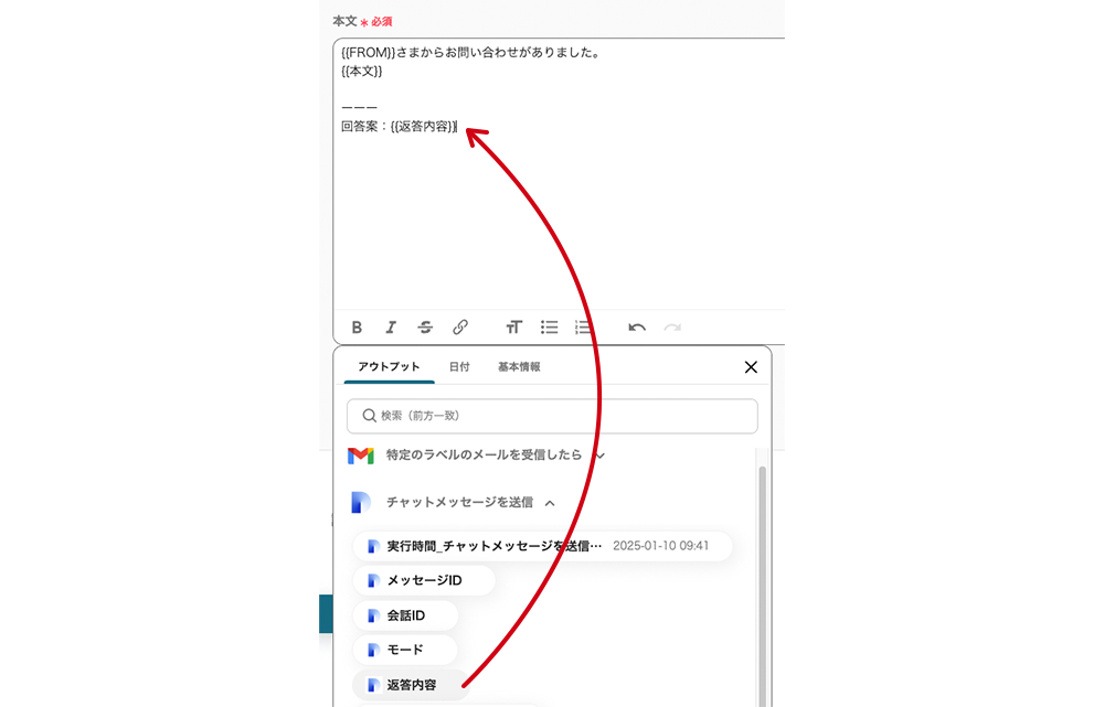 これまでの操作で取得したアウトプットを引用して定型文を作成します。編集欄をクリックすると、プルダウンが開き、取得したアウトプットが表示されます。
