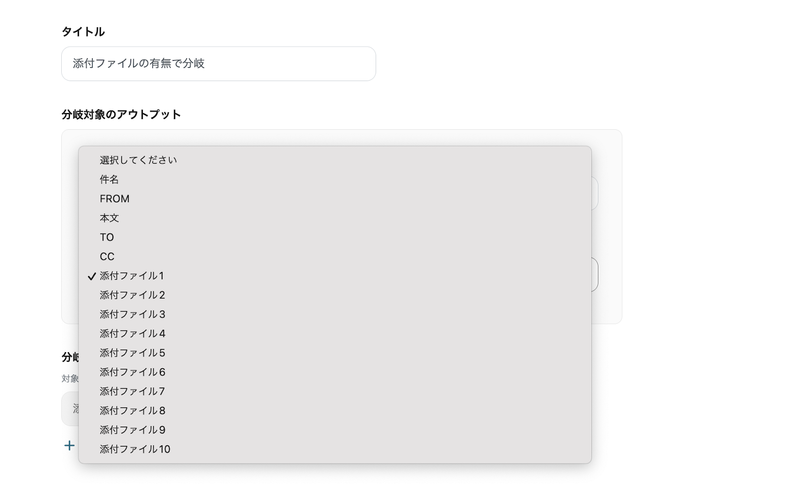 (1)次に、2つ目のステップ「添付ファイルの有無で分岐」をクリックし、内容を確認します。