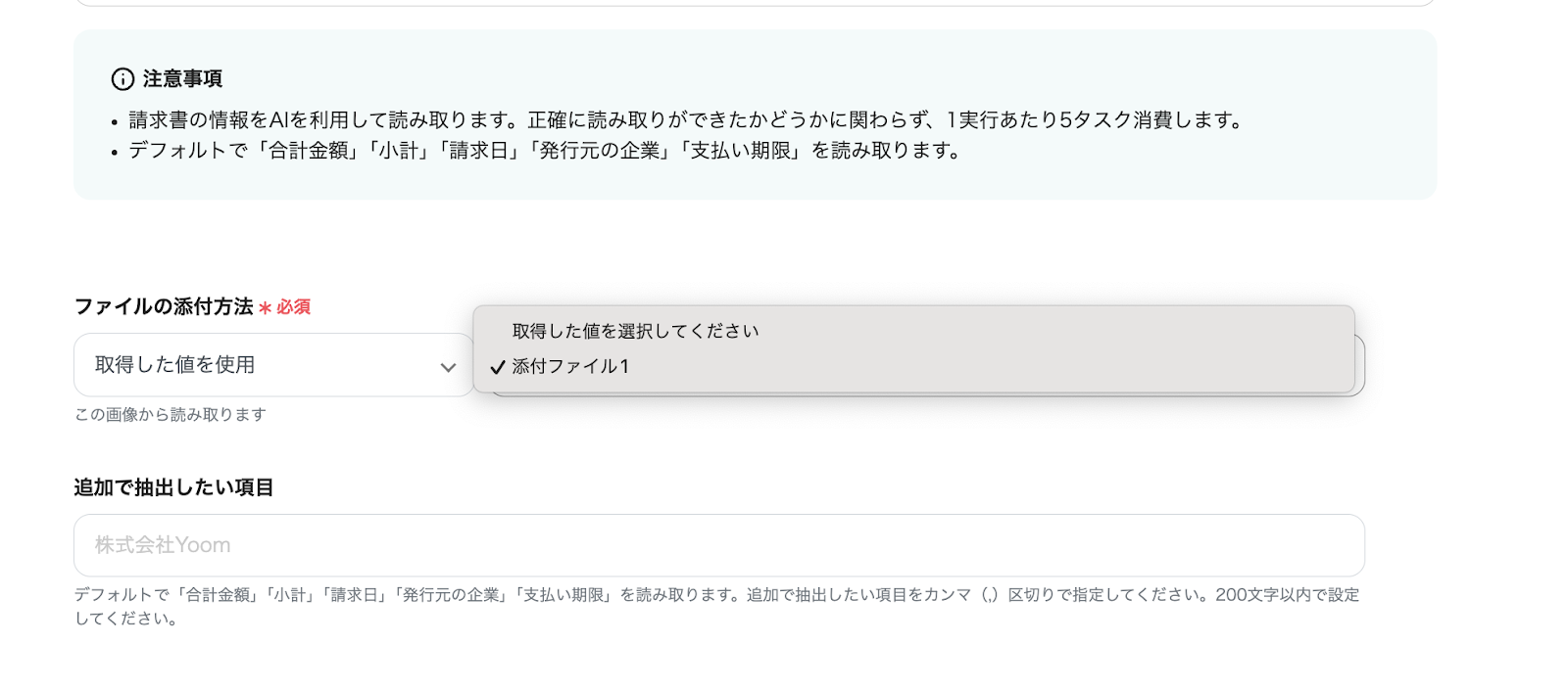 「追加で抽出したい項目」には、アップロードしたファイルからデフォルト(「合計金額」「小計」「請求日」「発行元の企業」「支払い期限」)以外で抽出したい情報を運用状況に沿って入力してください。