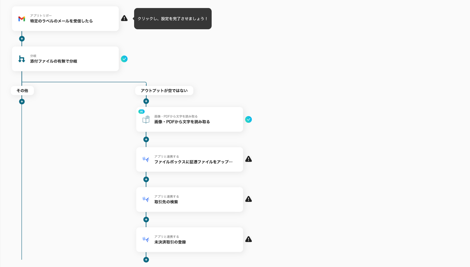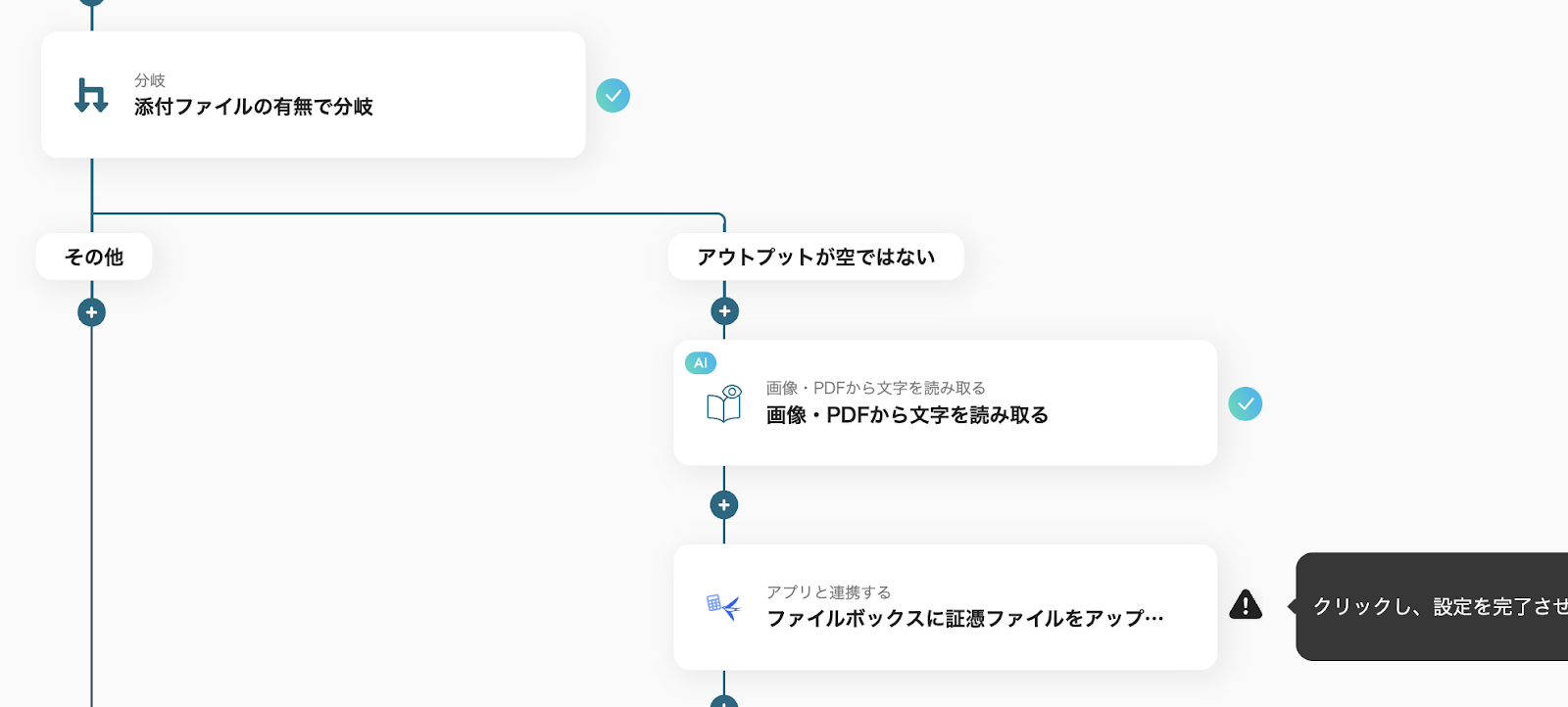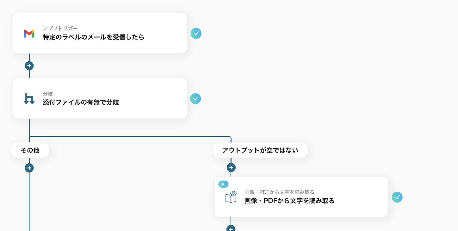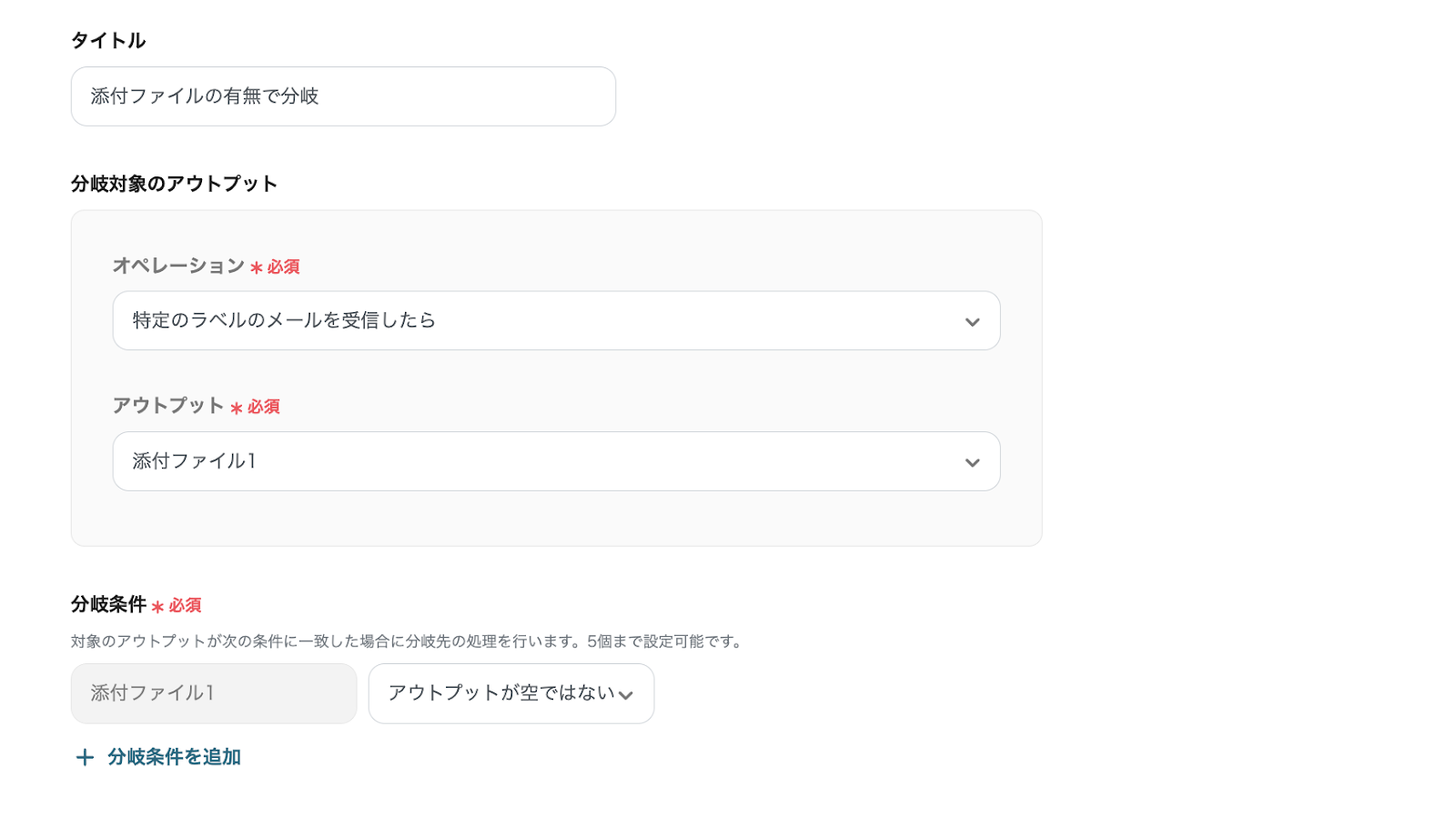 (3)今回のフローでは、『特定のラベルのメールを受信後、「アウトプット:メールの添付ファイル1」が【空でない状態】なら分岐する』ように設定を行っていきます。