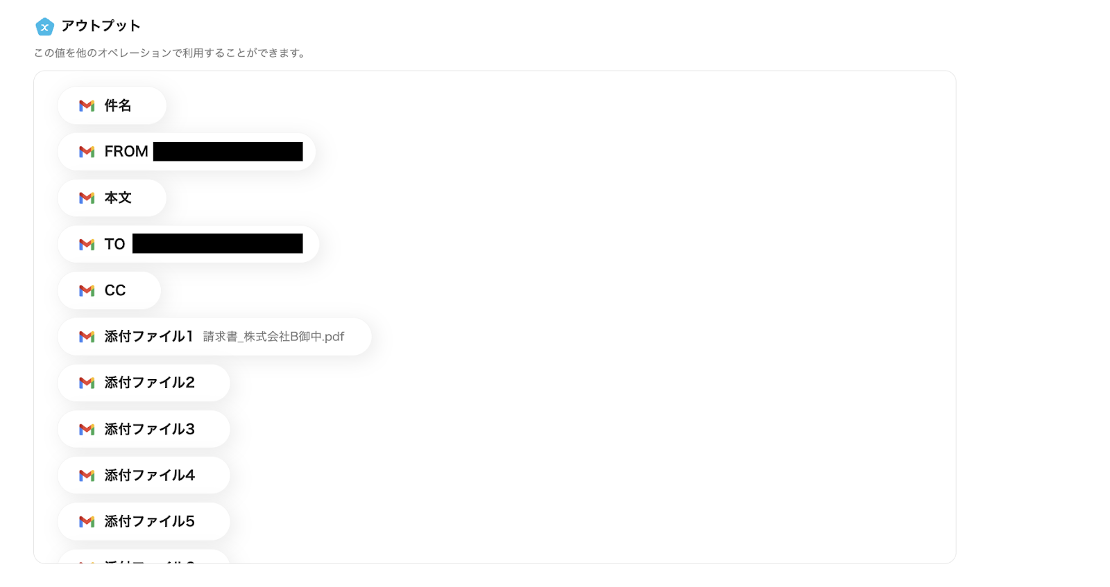アウトプット情報は、「この値を他のオペレーションで利用することができます。」という注釈の通り、この後のステップで引用・活用できます。