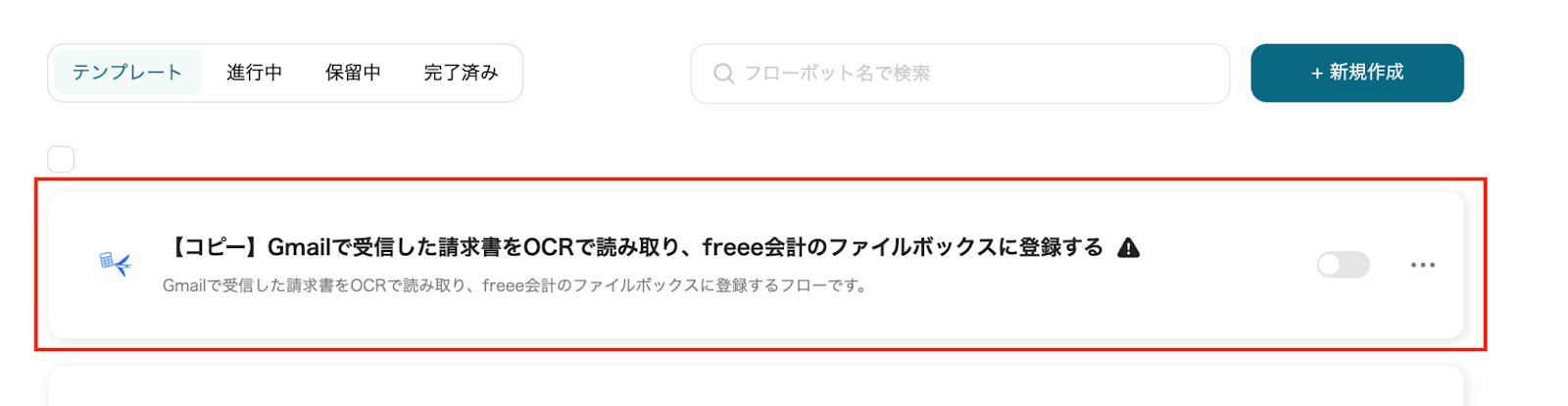 では、「Gmailで受信した請求書をOCRで読み取り、freee会計のファイルボックスに登録する」のテンプレートを使ったフローボットを作成していきましょう。