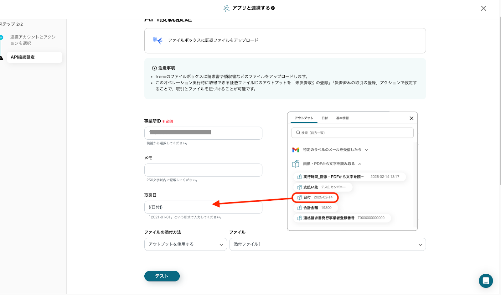 「ファイルの添付方法」は、デフォルトのまま変更せず「テスト」をクリックしてください。