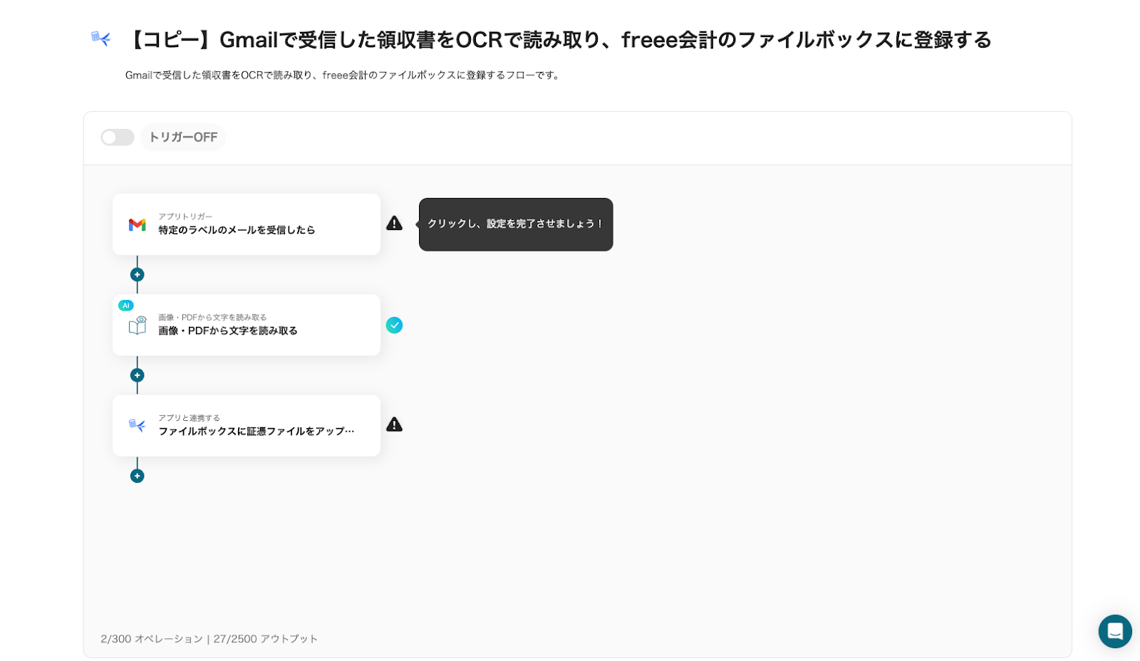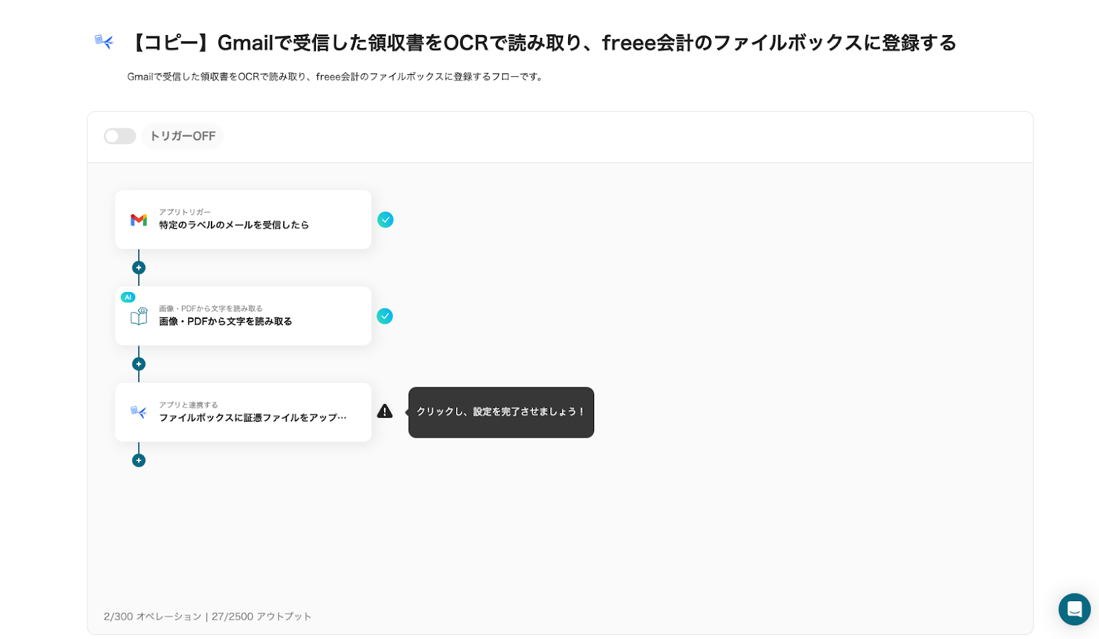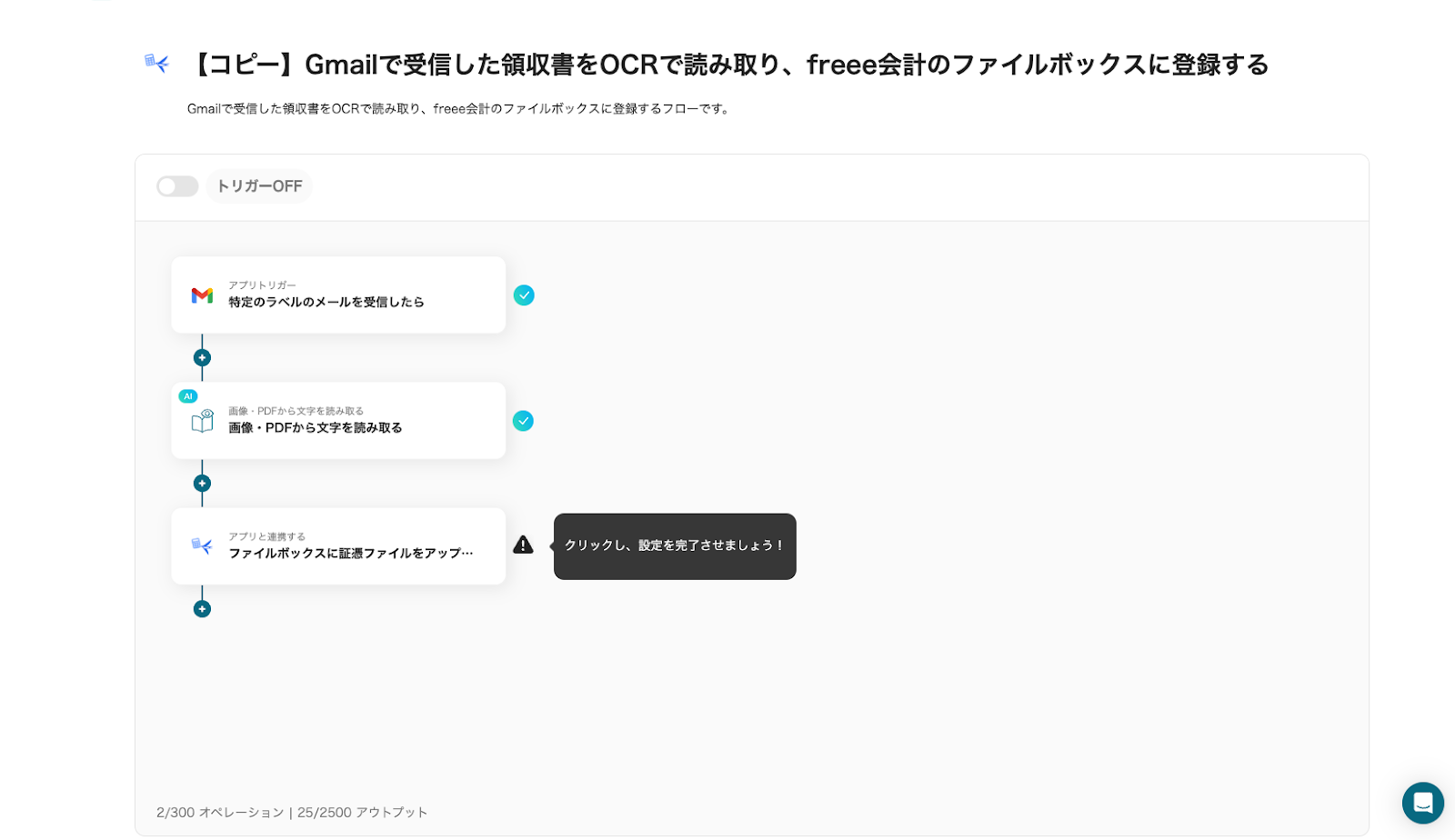最後に「トリガーをON」をクリックし、フロー稼働の準備が完了です。これでGmailで受信した領収書をOCRで読み取り、freee会計のファイルボックスに自動登録することができます。