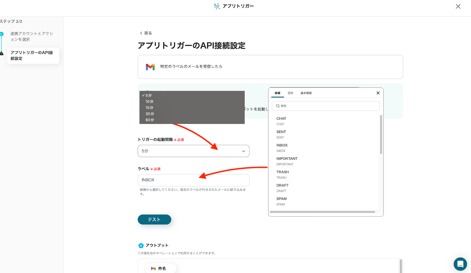 「トリガーの起動間隔」は5分、10分、15分、30分、60分から選択できます。
