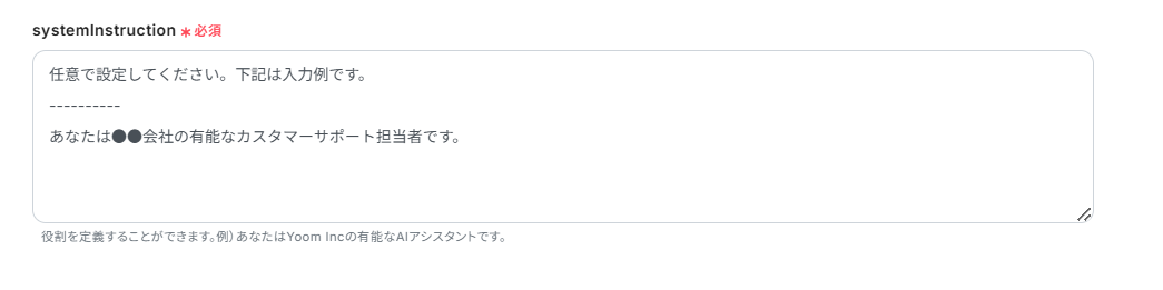 「systemInstruction」は以下の入力例を参考に入力してください。