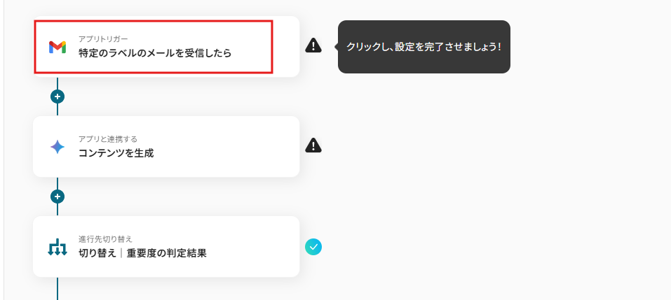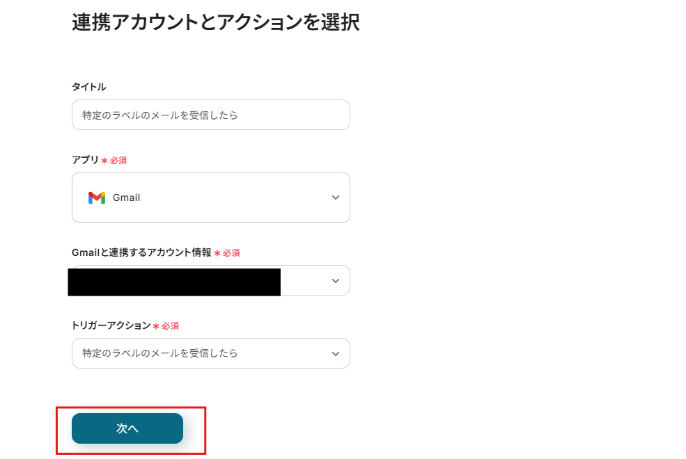 トリガーアクションは「特定のラベルのメールを受信したら」のままでOKです。