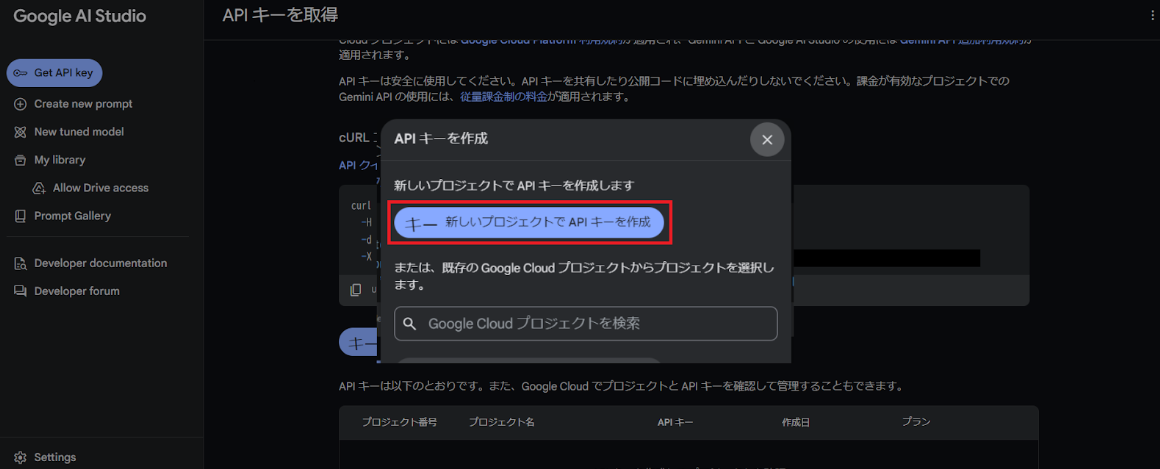 続けて「新しいプロジェクトでAPIキーを作成」を押します。