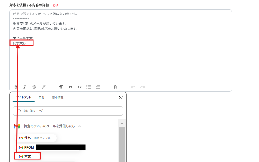 主に「対応を依頼する内容の詳細」を、重要度に合わせて変更するイメージです。