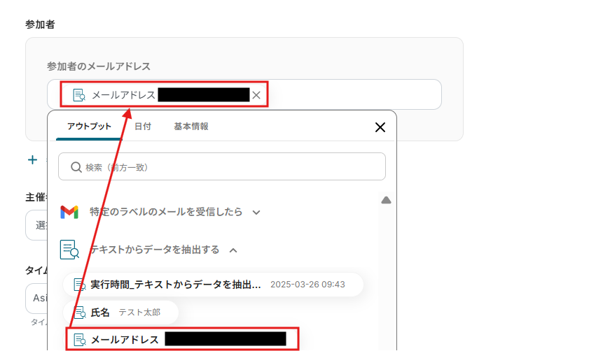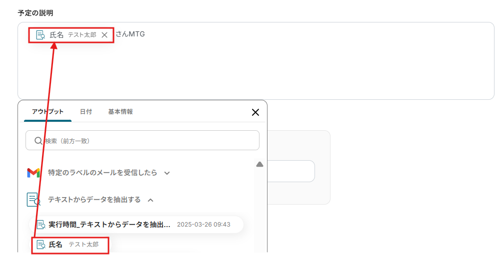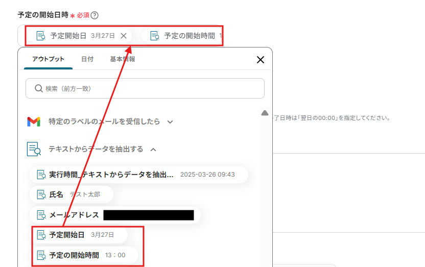 本文のテキストからデータ抽出して「予定の開始日時」に入るイメージです。