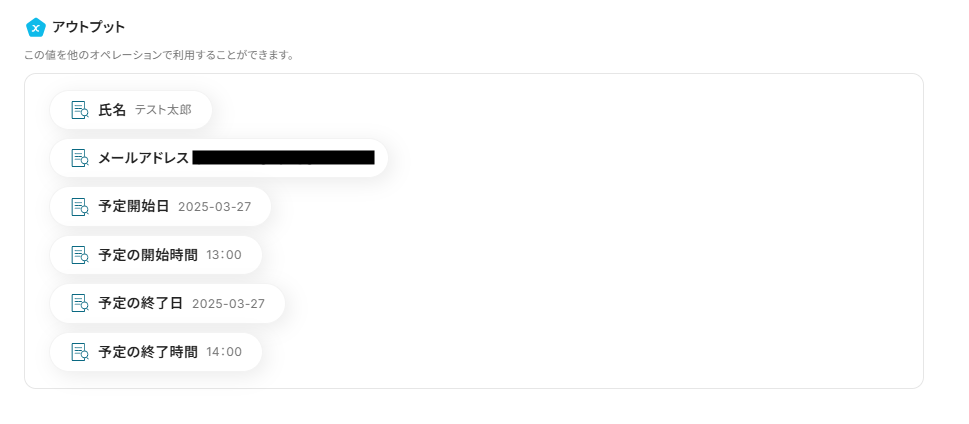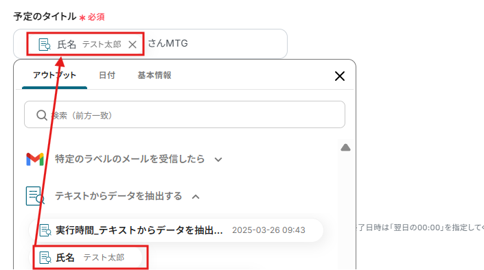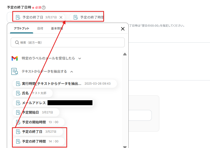 本文のテキストからデータ抽出して「予定の終了日時」に入ります。