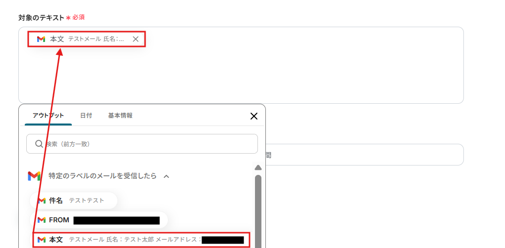 「対象のテキスト」は、アウトプットから本文を選択してください。