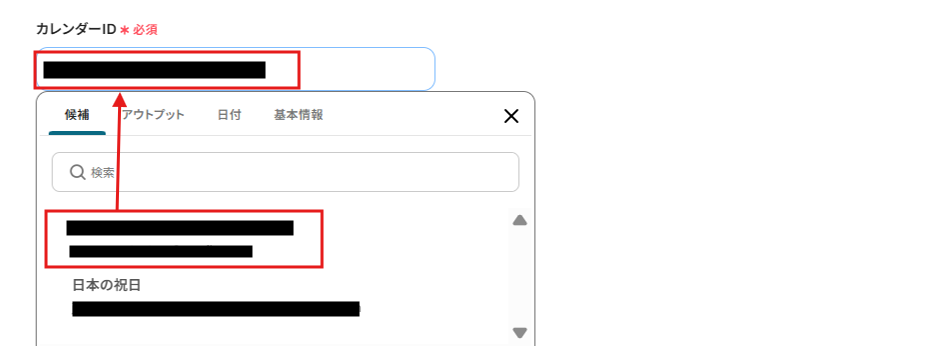 「カレンダーID」は候補から選択してください。