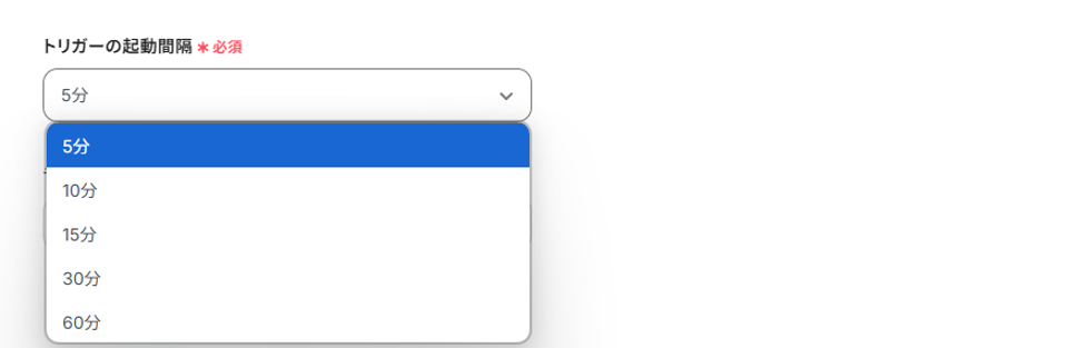 トリガーの起動タイミングは、5分、10分、15分、30分、60分のいずれかで設定できます。
