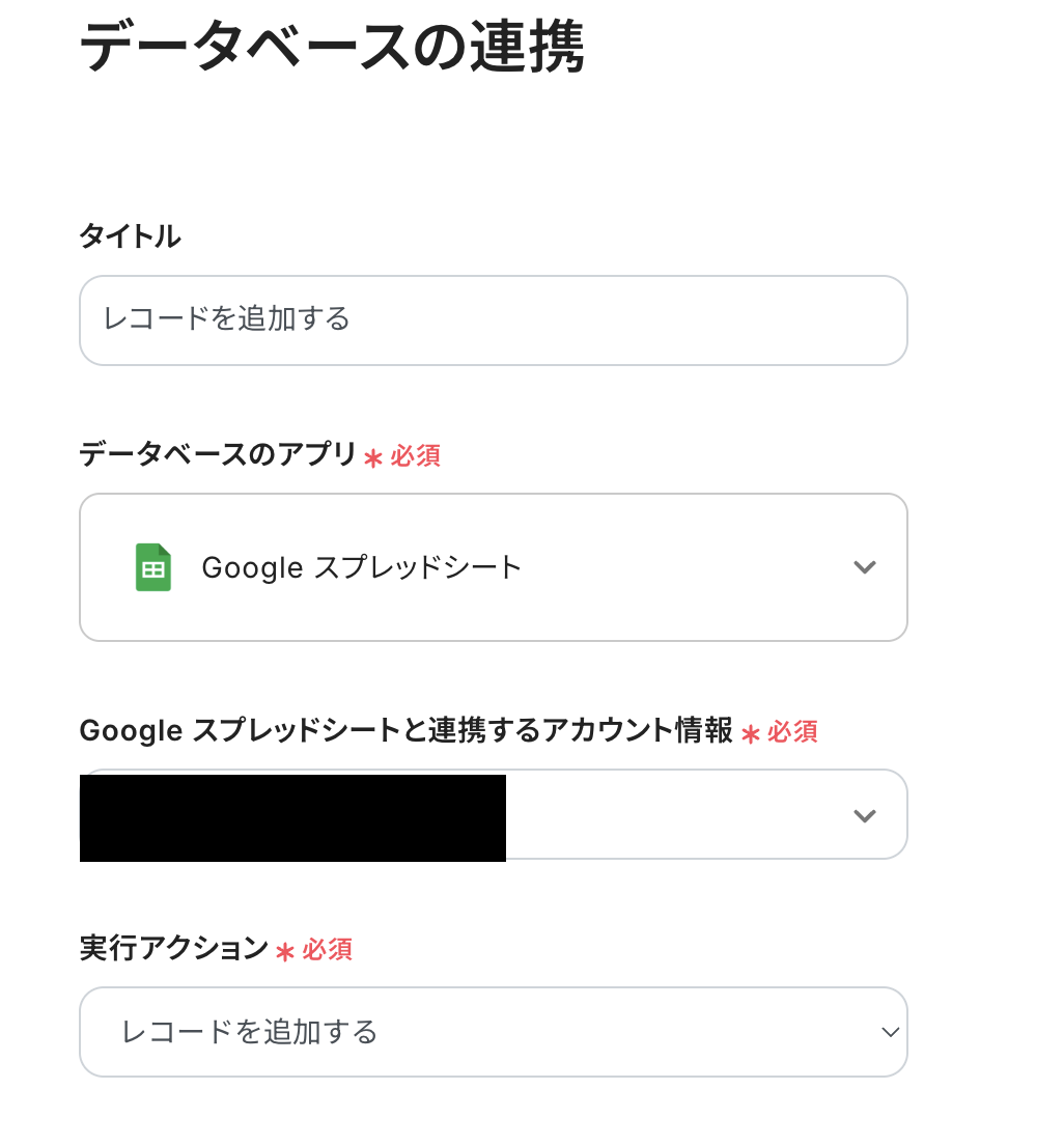 タイトルは変更できます。 Google スプレッドシートと連携するアカウント情報を確認しましょう。 アクションは「レコードを追加する」が選択されています。