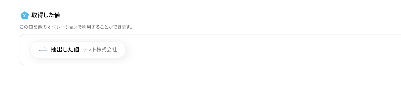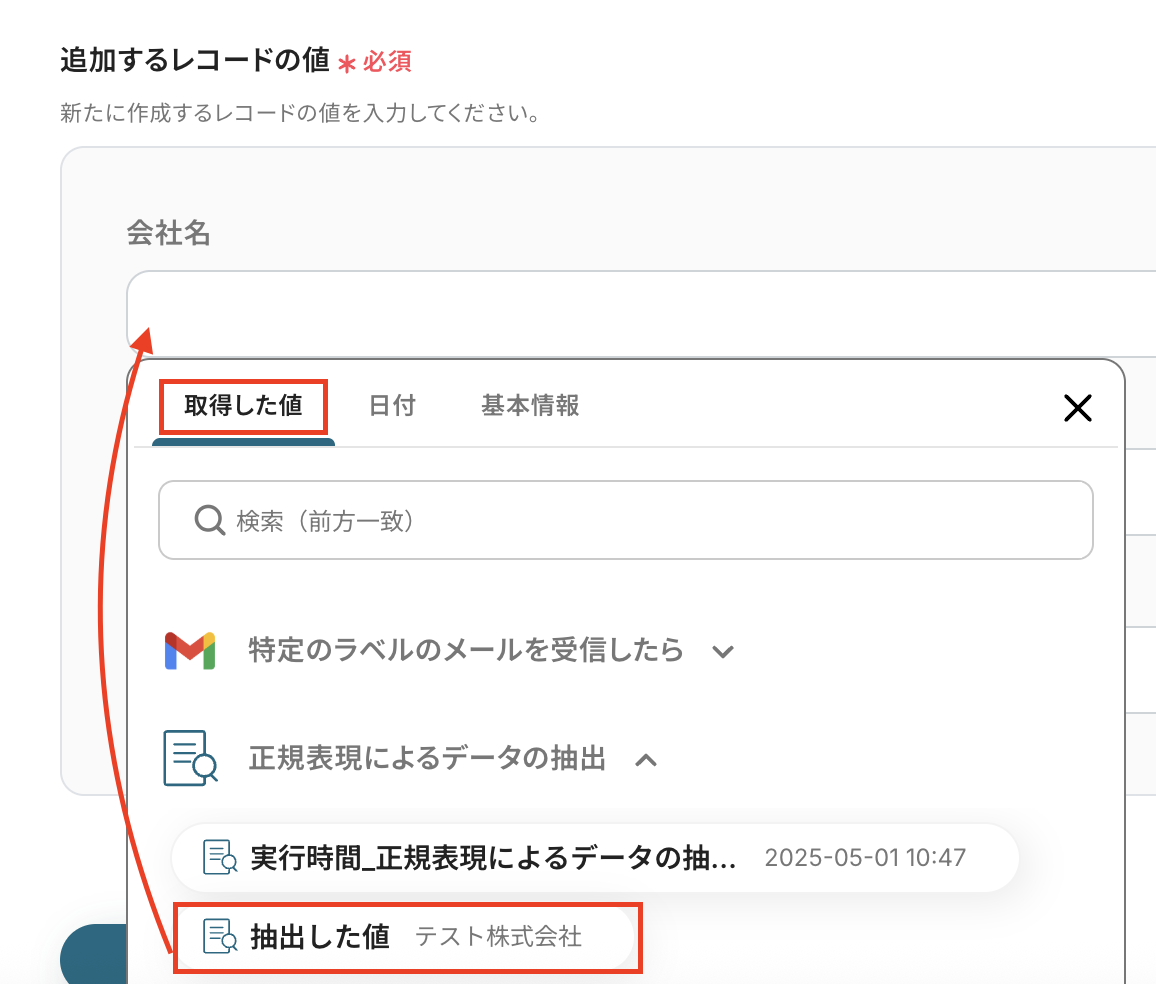 Google スプレッドシートのレコード情報が表示されていると思います。 正規表現によるデータの抽出で取得した値から「会社名」を選択してください。 設定したら、テストをクリックしましょう。