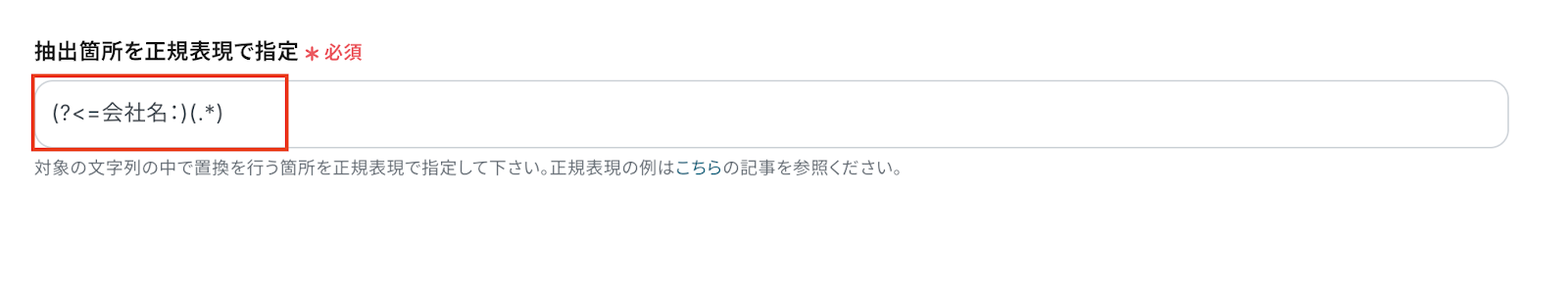 抽出箇所を正規表現で指定は、メール本文から抽出したい項目を設定します。 ここでは本文から「会社名」を抽出する設定をしています。 正規表現の例はこちら の記事を参考にしてください。 設定したらテストをクリックしましょう。