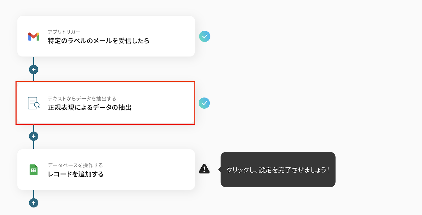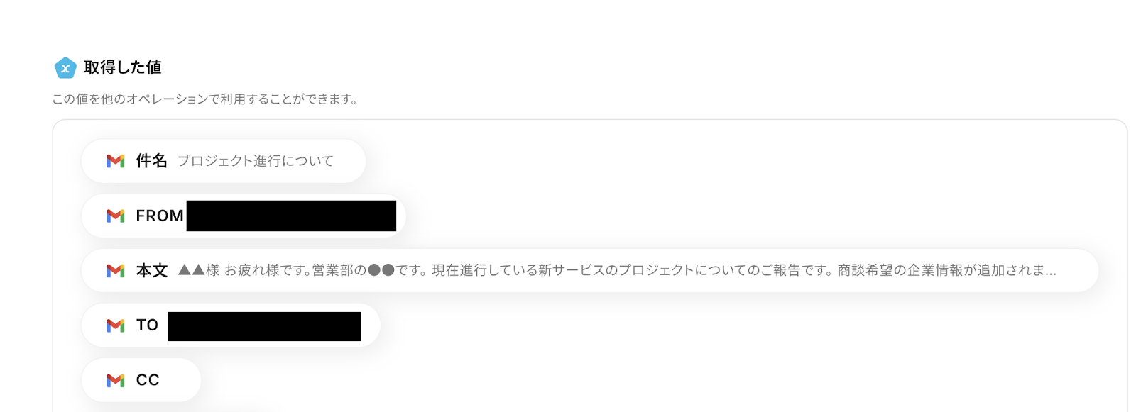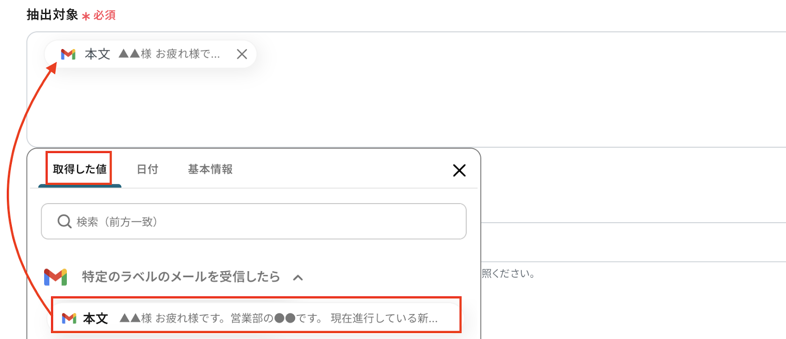 タイトルは変更OKです。 抽出対象は、Gmailの取得した値から「本文」を選択しましょう。 ここで取得した値を活用しなかった場合、同じメール文章でデータ抽出してしまうので、注意してください。 詳細はこちら を確認してください。