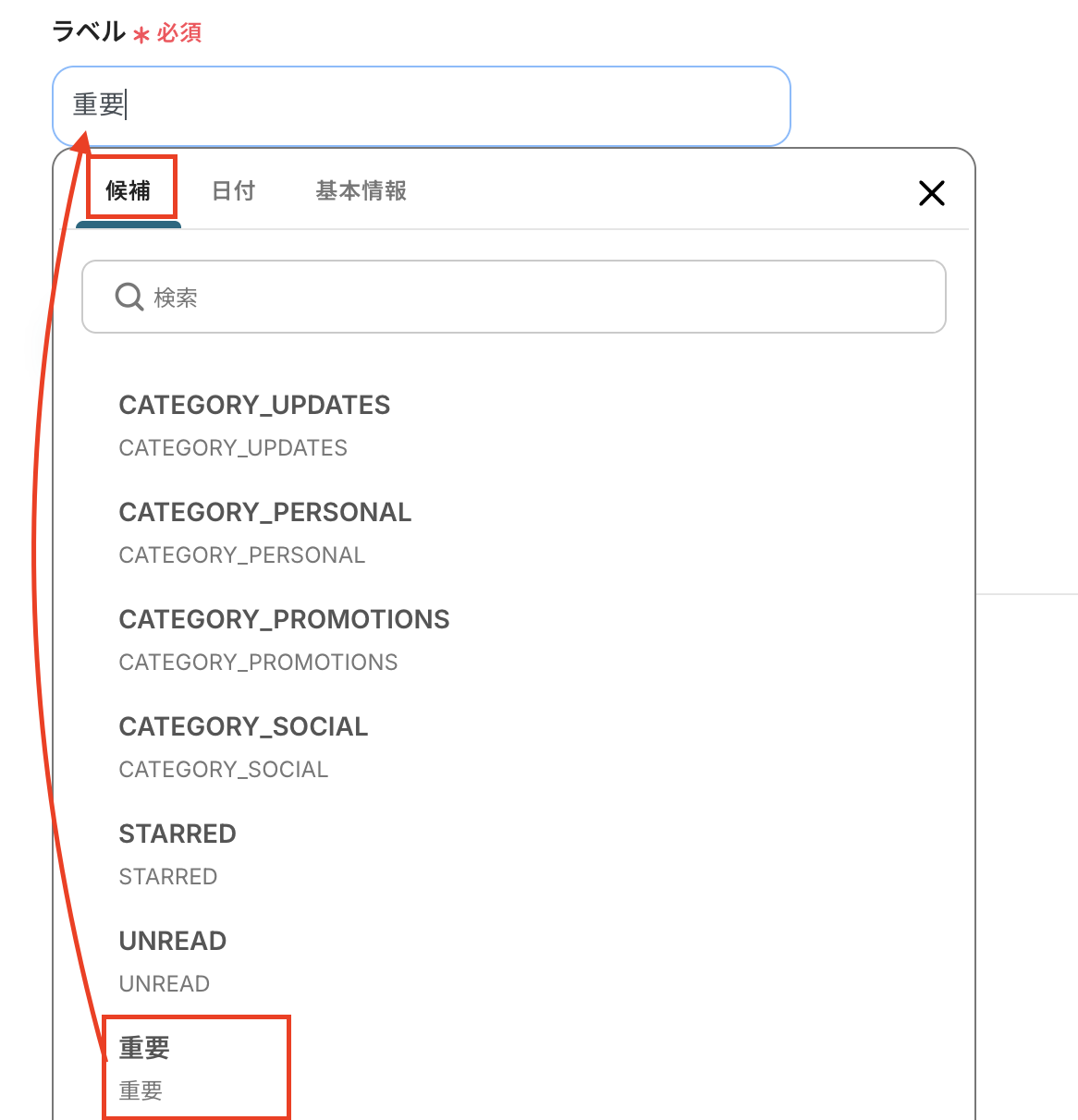 ラベルは候補から設定します。 ここでは「重要」と設定されているメール情報を取得する想定です。