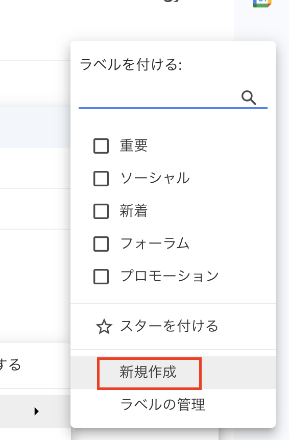 ここでラベル設定ができます。 こちらで設定してからメールを送信しましょう。 新規作成からラベルを追加することもできます。 設定できたら、実際にGmailで送信し、テストをクリックしてください。