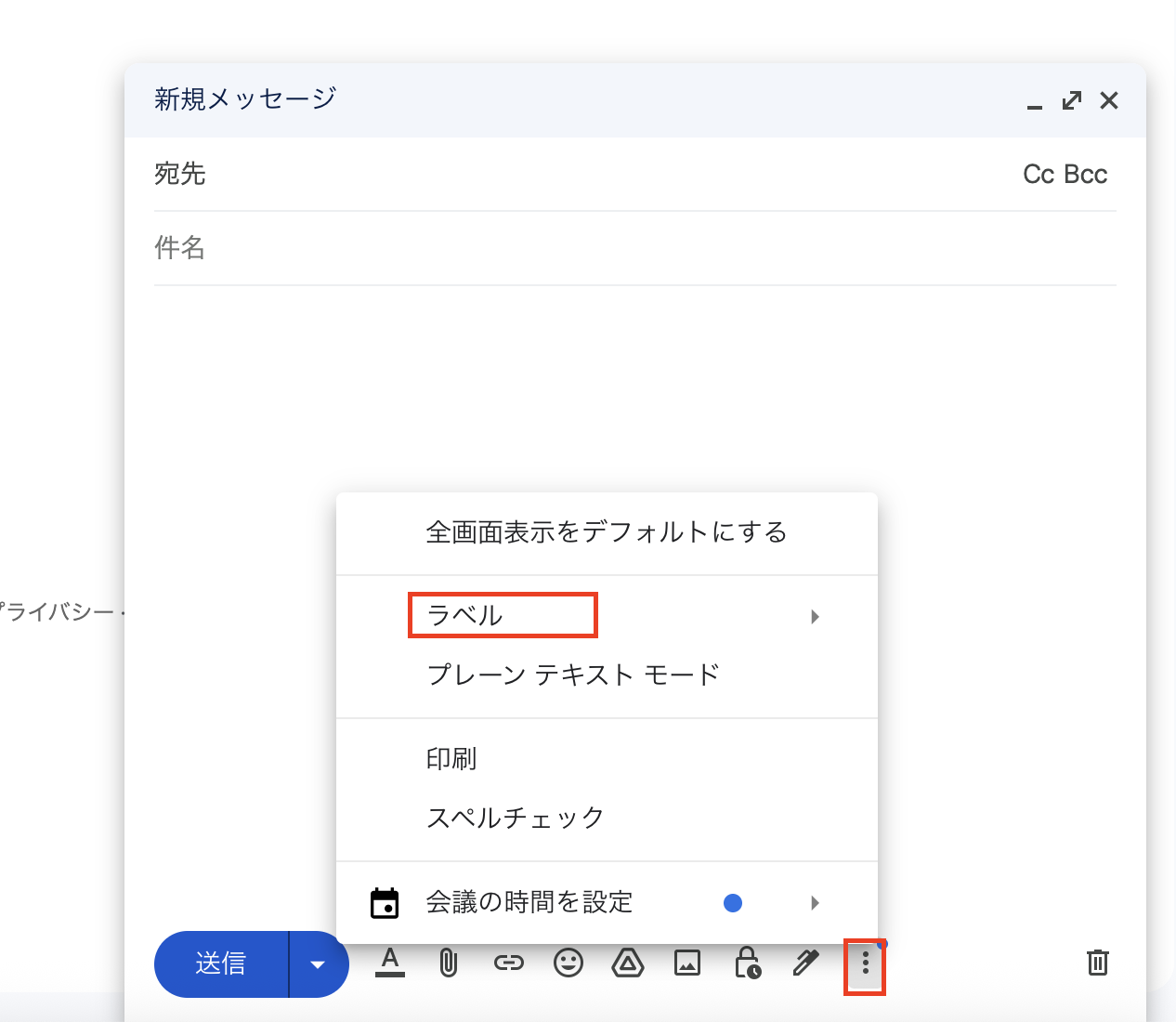 ラベルは、Gmailの新規メッセージ作成ページに進みます。 添付画像の三点リーダーを選択し、ラベルをクリックしましょう。
