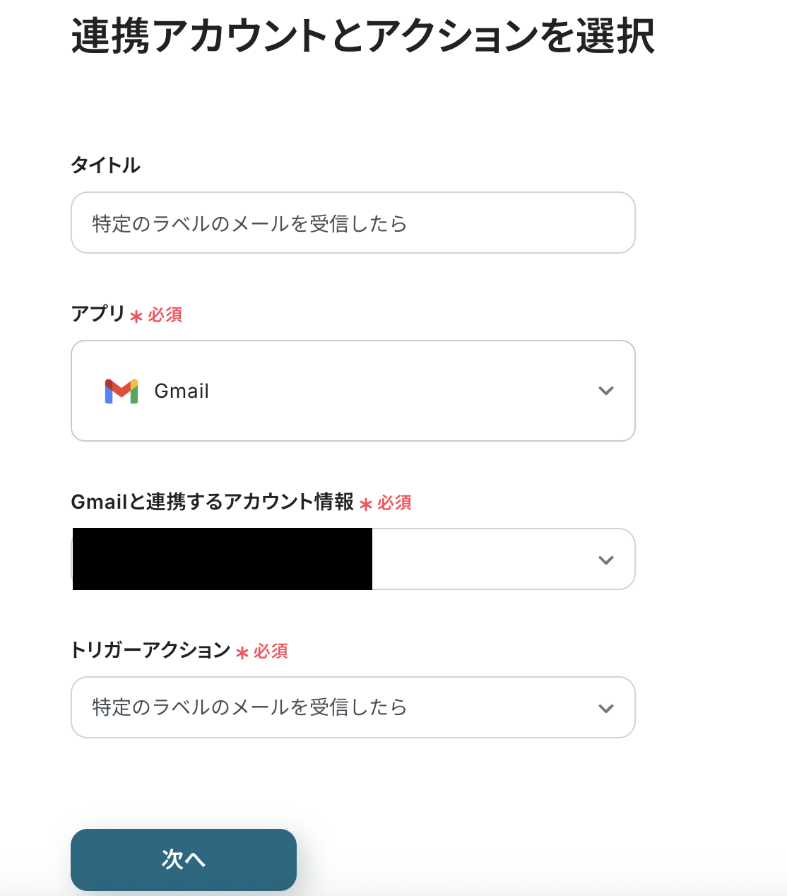 タイトルは変更OKです。 Gmailと連携するアカウント情報を確認しましょう。 トリガーアクションは「特定のラベルのメールを受信したら」が選択されています。 確認後、次へをクリックします。